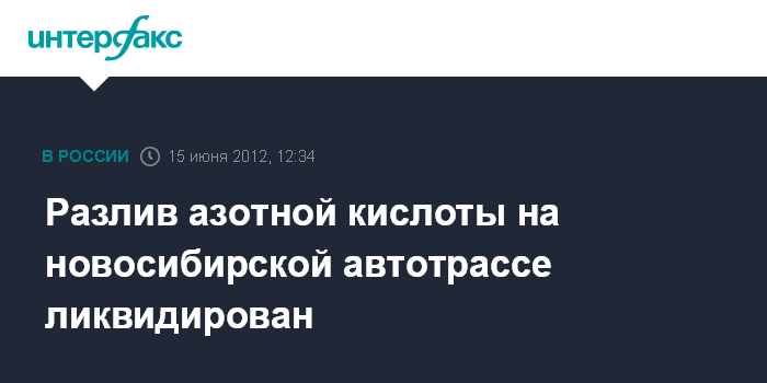 Новосибирск. 15 июня. INTERFAX.RU - На автодороге "Новосибирск-Павлодар" в Новосибирской области устранили разлив азотной кислоты, трасса открыта для движения.