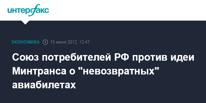 Москва. 15 июня. INTERFAX.RU - Союз потребителей России (СПРФ) выступает против законодательной инициативы министерства транспорта РФ о "невозвратных" авиабилетах, поскольку это создаст "правоприменительный хаос" и приведет к росту цен, говорится в пресс-релизе СПРФ.