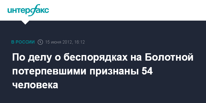 Москва. 15 июня. INTERFAX.RU - Следственный комитет РФ в ходе расследования уголовного дела о массовых беспорядках 6 мая в Москве признал потерпевшими 54 человека, сообщил официальный представитель СК РФ Владимир Маркин.