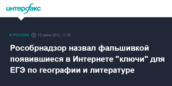 Как говорится в сообщении пресс-службы ведомства, поступившем в "Интерфакс", в сети Интернет распространяется некий документ, выдаваемый за письмо Федерального центра тестирования (ФЦТ), адресованное региональным центрам обработки информации и якобы содержащее "ключи" для проверки работ ЕГЭ по географии и литературе. Оба экзамена состоятся 16 июня. Рособрнадзор официально заявил, что распространяемое в Интернете изображение является фальшивкой.