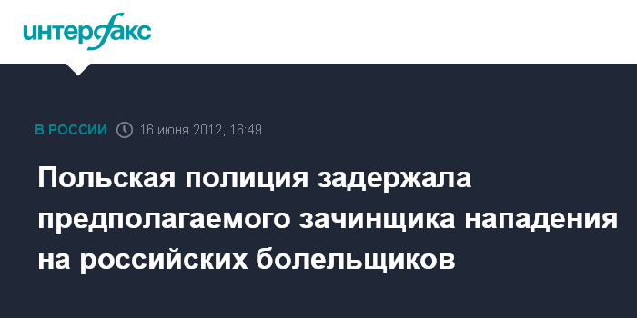 Варшава. 16 июня. INTERFAX.RU - В Польше задержаны предполагаемый организатор и еще 20 участников нападения на российских болельщиков на чемпионате по футболу Евро-2012, заявил журналистам в субботу пресс-секретарь варшавской полиции Мачей Карчиньски. "Уже задержаны 20 человек, из них 13 в Варшаве, также задержаны люди в Быдгощи, Катовицах, Кельцах, Лодзи. Один из них, предположительно, призывал других нападать. Розыскные мероприятия продолжаются, мы не прекращаем работу по опознанию и задержанию участников беспорядков", - сказал пресс-секретарь.