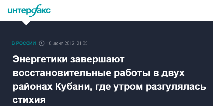 "В целом восстановительные работы в Белоглинском и Тихорецком районах завершены. Все основные линии электропередачи, поврежденные стихией, восстановлены. Остались единичные дворы, буквально десятки человек", - сказал А. Педченко агентству "Интерфакс-Юг".