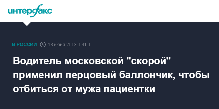 Москва. 18 июня. INTERFAX.RU - Водителю "скорой помощи" пришлось защищаться при помощи перцового баллончика от буйного мужа пациентки на северо-западе столицы, сообщил "Интерфаксу" источник в медицинских кругах.
