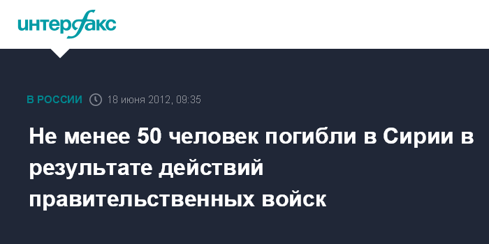 Лондон. 18 июня. INTERFAX.RU - Не менее 50 человек стали жертвами обстрела городов за прошедшие сутки в Сирии, сообщает британская газета The Guardian со ссылкой на активистов оппозиции.