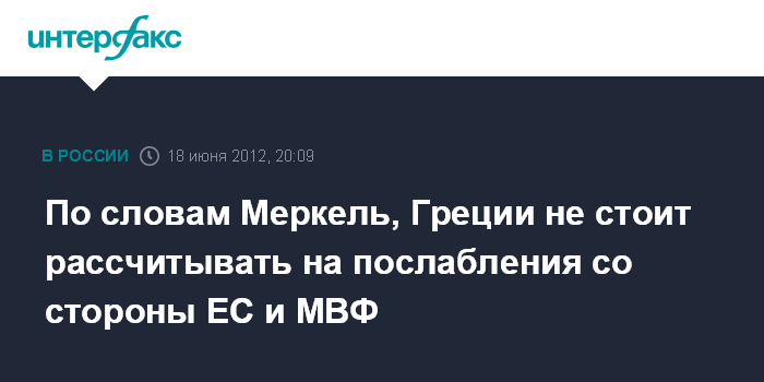 Лос-Кабос. 18 июня. INTERFAX.RU - Новое греческое правительство не может рассчитывать на послабления со стороны международных кредиторов, ранее предоставивших стране многомиллиардную помощь, приводит агентство Bloomberg слова федерального канцлера Германии Ангелы Меркель.