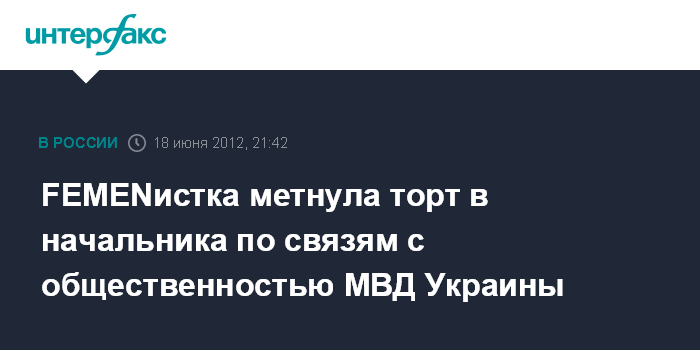Киев. 18 июня. INTERFAX.RU - Представительница движения FEMEN бросила торт в начальника управления по связям с общественностью МВД Украины Владимира Полищука.