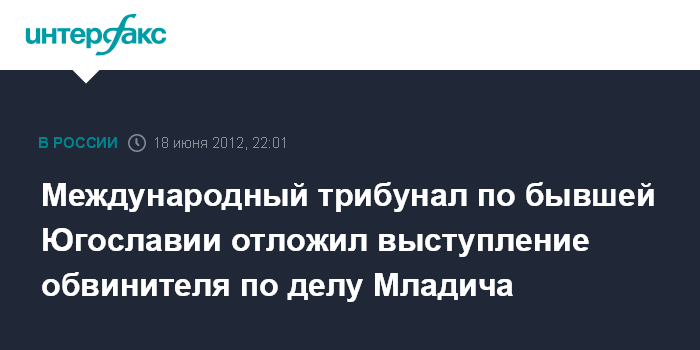 Гаага. 18 июня. INTERFAX.RU - Международный трибунал по бывшей Югославии (МТБЮ) решил перенести на более поздний срок выступление стороны обвинения на слушаниях дела бывшего военного лидера боснийских сербов Ратко Младича, передает в понедельник агентство АФП.