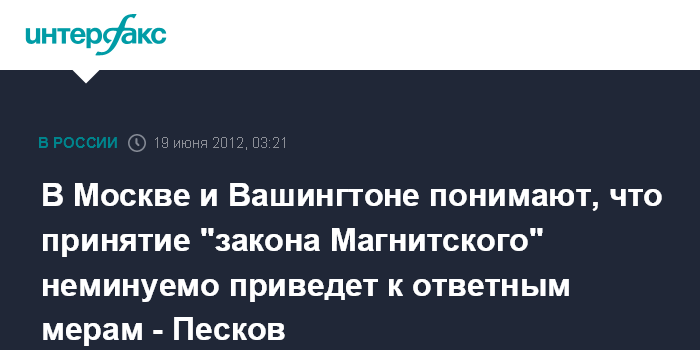 "Имеется полное понимание с обеих сторон того, что законодательное развитие ситуации по Магнитскому неминуемо приведет к ответным мерам", - заявил Д.Песков на брифинге журналистам по итогам встречи президентов России и США Владимира Путина и Барака Обамы в Лос-Кабосе.