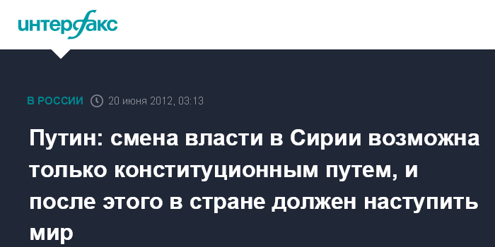 "Важно, чтобы произошла не просто смена режима, а важно, чтобы после смены власти, если она произойдет, - а произойти она должна только конституционным путем - чтобы после этого в стране наступил мир и прекратилось кровопролитие", - сказал В.Путин на пресс-конференции по итогам саммита "двадцатки" в Лос-Кабосе, отвечая на вопрос об отношении Москвы к требованиям Запада об уходе президента Башара Асада.