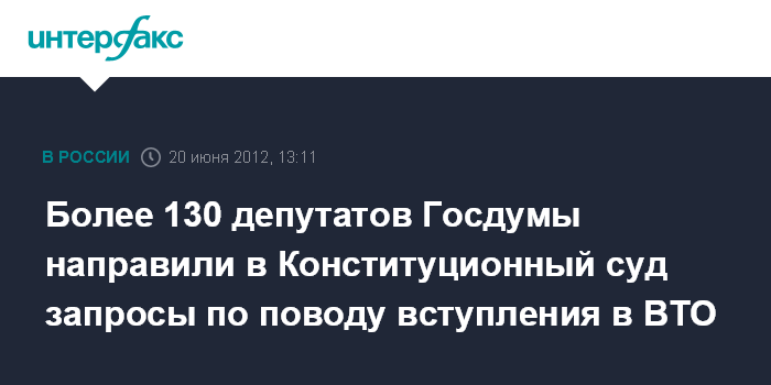 Москва. 20 июня. INTERFAX.RU - Более 140 депутатов Госдумы от КПРФ и "Справедливой России" подали в Конституционный суд запрос "о проверке конституционности не вступившего в силу протокола о вступлении Российской Федерации в ВТО".