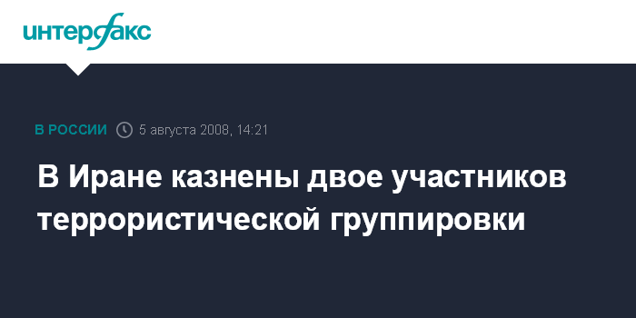 Москва. 5 августа. INTERFAX.RU - Два участника запрещенной в Иране террористической группировки "Джодолла" повешены в городе Хазедане, сообщает во вторник иранский англоязычный телеканал "Пресс-ТВ" со ссылкой на представителей местного правосудия.