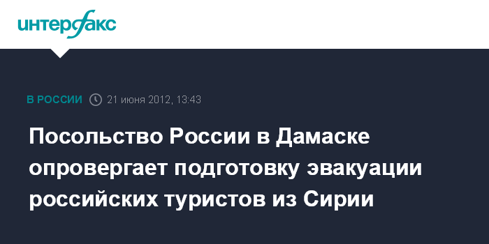 Москва. 21 июня. INTERFAX.RU - В посольстве РФ в Дамаске опровергают информацию о возможной скорой эвакуации россиян из Сирии.