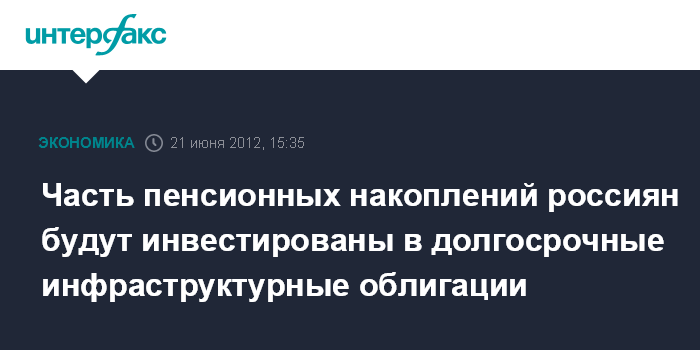 Санкт-Петербург. 21 июня. INTERFAX.RU - Президент РФ Владимир Путин объявил о принятом решении инвестировать часть пенсионных накоплений граждан в долгосрочные инфраструктурные облигации.