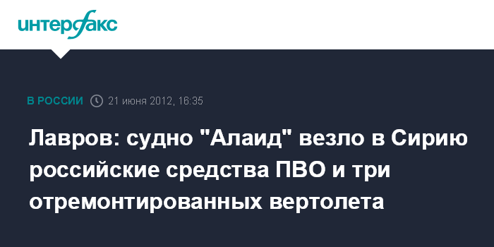 Москва. 21 июня. INTERFAX.RU - Судно "Алаит" везло в Сирию средства ПВО и отремонтированные вертолеты, сообщил глава МИД РФ Сергей Лавров.