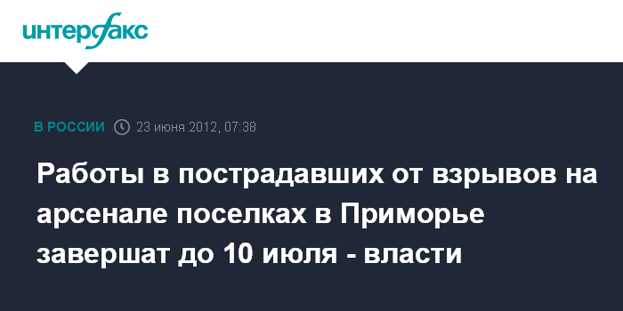 Владивосток. 23 июня. INTERFAX.RU - Восстановительные работы в населенных пунктах Спасского района Приморья, пострадавших от взрыва боеприпасов, будут завершены до 10 июля, сообщил вице-губернатор Приморского края Владимир Балан в субботу в ходе выездного совещания в Спасском районе.