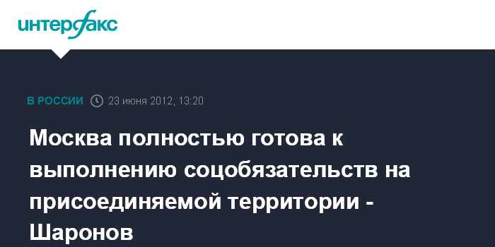 Санкт-Петербург. 23 июня. INTERFAX.RU - Власти Москвы полностью готовых к выполнению социальных обязательств перед жителями присоединяемой к столице территории, заявил заместитель мэра Москвы по вопросам экономической политики Андрей Шаронов. "Я думаю, что подводных камней с точки зрения социальных обязательств не возникнет", - заявил он в интервью телеканалу "Россия 24".