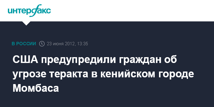 Найроби. 23 июня. INTERFAX.RU - Посольство США в Кении распространило предупреждение об угрозе террористического нападения на граждан страны во втором по величине кенийском городе Момбаса, говорится в заявлении дипведомства, распространенном в субботу. "Мы предупреждаем всех граждан США, находящихся в Кении или планирующих отправиться в эту страну в ближайшем будущем, о том, что посольство США в Найроби получило информацию об угрозе теракта в кенийском городе Момбаса", - отмечается в сообщении.