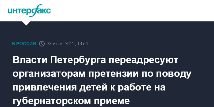 Санкт-Петербург. 23 июня. INTERFAX.RU - Юридическая и этическая ответственность за привлечение детей к проведению приема губернатора Петербурга Георгия Полтавченко в ходе XVI международного экономического форума полностью лежит на компании, организовывавшей мероприятие, заявил "Интерфаксу" в субботу пресс-секретарь главы города Андрей Кибитов.