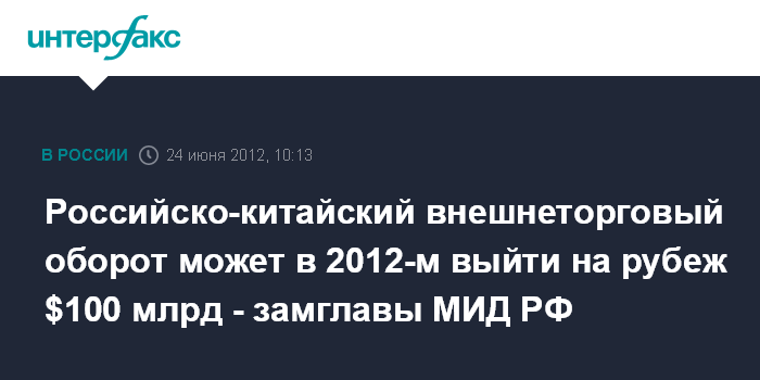 Москва. 24 июня. INTERFAX.RU - Объем торговли между Россией и Китаем в 2012 может составить $100 млрд, заявил "Интерфаксу заместитель министра иностранных дел РФ Игорь Моргулов. "Можно сказать, что реализация поставленной главами двух государств цели - доведение ежегодного объема двусторонней торговли до 100 млрд долл США к 2015 году и до 200 млрд к 2020 году - задача вполне реальная. При сохранении динамики последних лет стомиллиардный рубеж товарооборота вполне может быть преодолен уже в этом году", - считает И.Моргулов.