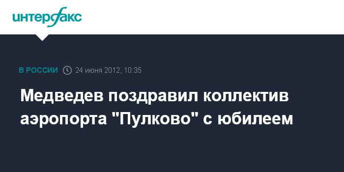 Москва. 24 июня. INTERFAX.RU - Премьер-министр России Дмитрий Медведев поздравил руководство, коллектив и ветеранов аэропорта "Пулково" с 80-летием, сообщает сайт правительства.