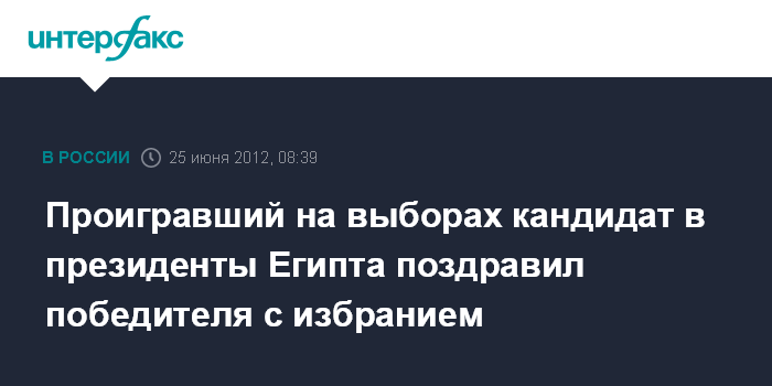 Каир. 25 июня. INTERFAX.RU - Уступивший на египетских выборах кандидат на пост главы государства Ахмад Шафик, сторонник свергнутого президента Хосни Мубарка, поздравил избранного президентом страны Мухаммеда Мурси с победой, сообщило местное агентство МЕНА.