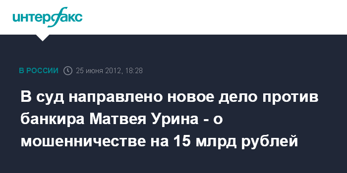 Москва. 25 июня. INTERFAX.RU - Уголовное дело в отношении банкира Матвея Урина, осужденного на 4,5 года колонии за избиение в 2010 г. иностранца на Рублевском шоссе, направлено в суд и касается обвинения в мошенничестве с вкладами граждан на сумму более 15 млрд рублей.