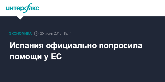 Москва. 25 июня. INTERFAX.RU - Испания в понедельник официально обратилась к Евросоюзу с просьбой предоставить ей помощь, сообщает MarketWatch. Страна попросила у ЕС 100 млрд евро для рекапитализации банковского сектора.