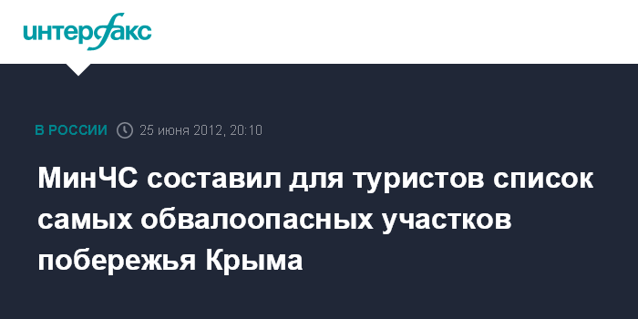 Симферополь. 25 июня. INTERFAX.RU - Крымский главк МинЧС с целью предупреждения несчастных случаев составил для туристов перечень наиболее обвалоопасных участков побережья Крыма.