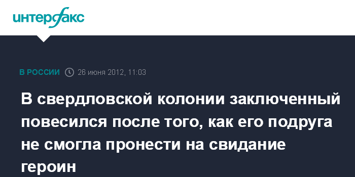 Екатеринбург. 26 июня. INTERFAX.RU - В исправительной колонии строгого режима N47 в городе Каменске-Уральском (Свердловская область) заключенный покончил с собой после задержания его сожительницы, приехавшей к нему на свидание с наркотиками.