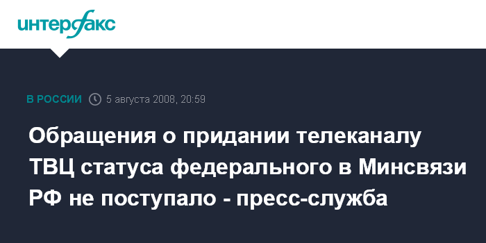 Обращения о придании телеканалу ТВЦ статуса федерального в Минсвязи РФ не поступало - пресс-служба