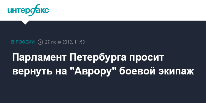 Санкт-Петербург. 27 июня. INTERFAX.RU - Законодательное собрание Петербурга обратилось к Верховному главнокомандующему РФ Владимиру Путину с просьбой вернуть на крейсер "Аврора" боевой экипаж, сокращенный в 2010 году. Автором обращения выступил "единоросс" Андрей Васильев, который подчеркнул, что "Аврора" по-прежнему находится в составе Военно-морского флота РФ и сохраняет статус корабля №1.