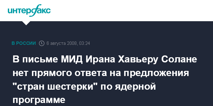 В письме МИД Ирана Хавьеру Солане нет прямого ответа на предложения "стран шестерки" по ядерной программе