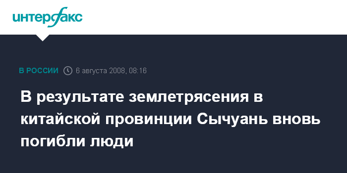 Москва. 6 августа. INTERFAX.RU - Три человека погибли и более 20-ти получили ранения в результате повторного подземного толчка в уезде Цинчуань китайской провинции Сычуань,произошедшего во вторник, сообщили местные СМИ со ссылкой на заявление представителя властей Цинчуаня.