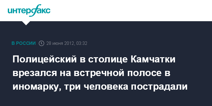 "Авария произошла в среду. По предварительным данным, помощник оперативного дежурного дежурной части УМВД России по городу Петропавловску-Камчатскому, возвращался с суточного дежурства на личном автомобиле "Субару Форестер". На улице Зеркальная полицейский пересек сплошную линию разметки, выехал на полосу встречного движения и в лобовую столкнулся с автомашиной "Тойота Спринтер", в которой находились три человека", - сказала Е.Матафонова.