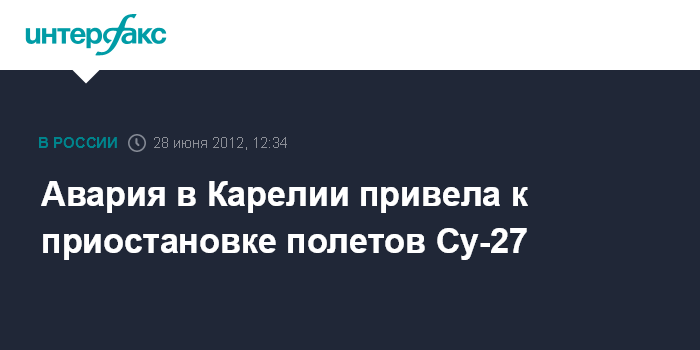 Москва. 28 июня. INTERFAX.RU - Полеты истребителей Су-27 приостановлены до выяснения причин аварии истребителя этого типа в Карелии, сообщил "Интерфаксу-АВН" в четверг официальный представитель ВВС полковник Владимир Дрик.