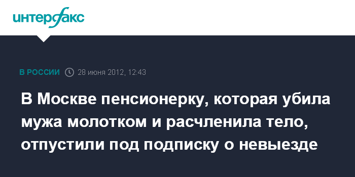 Москва. 28 июня. INTERFAX.RU - Пенсионерка в Москве в ссоре убила молотком своего престарелого мужа, а затем расчленила тело, чтобы спрятать останки, но не успела из-за вернувшегося домой внука.