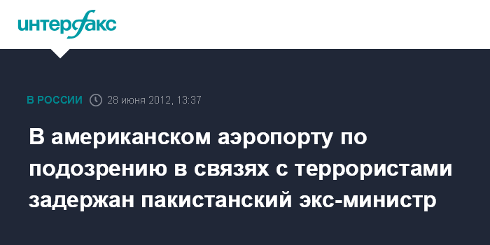 Исламабад. 28 июня. INTERFAX.RU - Бывший пакистанский министр Шейх Рашид задержан в аэропорту "Хьюстон Интерконтинентал" по подозрению в связях с основателем террористической организации "Лашкар-и-Тайба" Хафизом Мохаммедом Саидом, сообщает в четверг индийский телеканал NDTV. Рашида отпустили после пятичасового допроса.