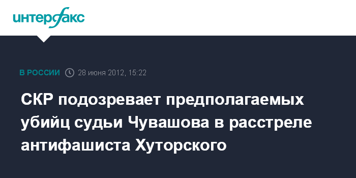 Москва. 28 июня. INTERFAX.RU - Подозреваемые в убийстве судьи Эдуарда Чувашова могут быть причастны к расстрелу в 2009 г. одного из лидеров движения "Антифа" Ивана Хуторского, сообщил официальный представитель СК РФ Владимир Маркин.