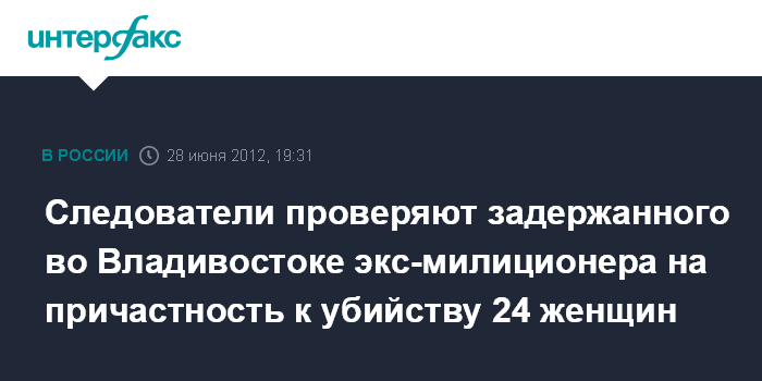 Москва. 28 июня. INTERFAX.RU- Задержанный во Владивостоке бывший милиционер проверяется на причастность к серии убийств молодых женщин в Сибири, сообщил журналистам в четверг представитель пресс-центра МВД России. "Для расследования преступлений прошлых лет на территории Сибирского федерального округа была создана оперативная группа, в состав которой вошли следователи Следственного комитета и сотрудники уголовного розыска, она работала более 10 лет и, в частности, занималась расследованием убийств женщин, которые были совершены до 1998 года в Ангарске и других городах региона", - сказал собеседник агентства.
