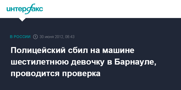 Чита. 30 июня. ИНТЕРФАКС-СИБИРЬ - Сержант полиции сбил шестилетнюю девочку на пешеходном переходе в Барнауле, проводится служебная проверка, сообщает пресс-служба ГУ МВД по Алтайскому краю.