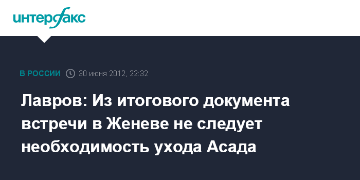 Женева. 30 июня. ИНТЕРФАКС - Из итогового документа женевской конференции по Сирии не вытекает необходимость отставки президента Сирии Башара Асада, заявил министр иностранных дел России Сергей Лавров.