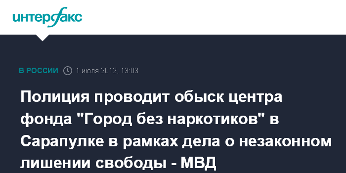 Екатеринбург. 1 июля. INTERFAX.RU - ГУ МВД по Свердловской области официально подтвердило факт проведения оперативных мероприятий в реабилитационном женском центре фонда "Город без наркотиков" в населенном пункте Сарапулка (Березовский городской округ, Свердловская область).