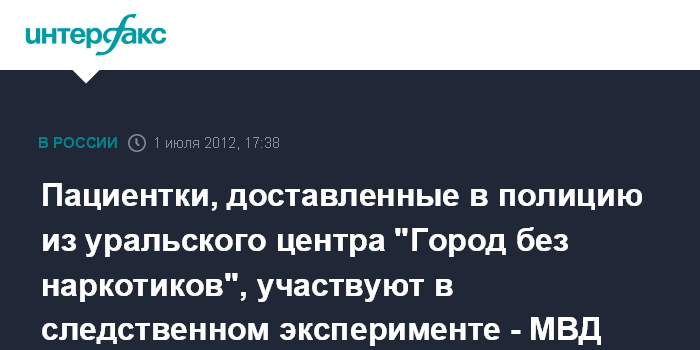 Екатеринбург. 1 июля. INTERFAX.RU - В воскресенье из реабилитационного центра фонда "Город без наркотиков", который находится в населенном пункте Сарапулка под городом Березовский в Свердловской области, в полицию были доставлены три девушки - пациентки фонда и один молодой человек.