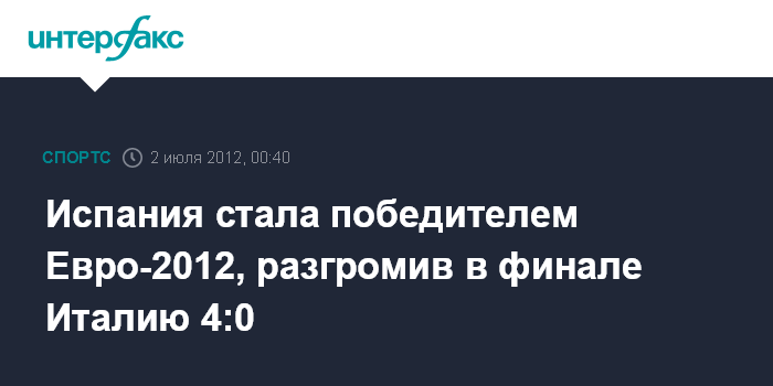 Встреча, которая проходила на Олимпийском стадионе в Киеве, завершилась со счетом 4:0. Давид Сильва на 14-й минуте открыл счет, Хорди Альба на 41-й минуте забил второй мяч в ворота сборной Италии, Фернандо Торрес на 84-й минуте довел счет до крупного, а Хуан Мата на 88-й минуте довершил разгром сборной Италии.