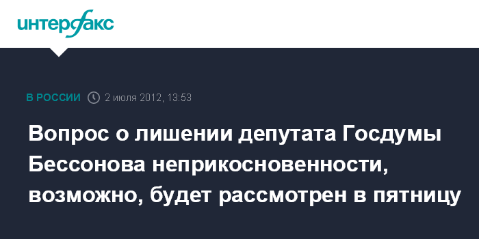 29 июня стало известно, что в Госдуму поступило обращение генпрокурора Юрия Чайки в отношении Бессонова с просьбой дать согласие на возбуждение уголовного дела в связи с событиями 2 декабря. Ранее, 21 июня, Совет Госдумы уже принял решение не рассматривать поступившее в палату аналогичное заявление Следственного комитета. "Анализ этих материалов показал, что такое представление в Думу может сделать только генпрокурор РФ", - сказал тогда Сергей Нарышкин.