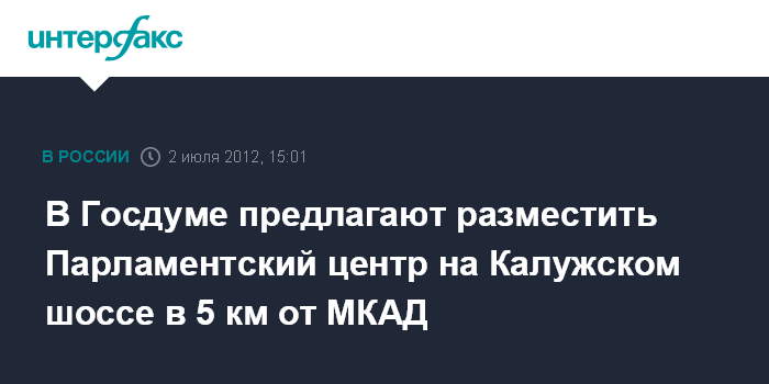 "Из всех рассмотренных вариантов размещения Парламентского центра на присоединяемых к Москве территориях наиболее предпочтительным как с точки зрения транспортной доступности, так и с точки зрения обеспечения коммуникациями и инженерной инфраструктурой представляется участок площадью 160 га по Калужскому шоссе, слева по ходу из Москвы, в пяти км от МКАД", - сказал руководитель думской комиссии по строительству зданий и сооружений, предназначенных для размещения такого Центра, Владимир Ресин.