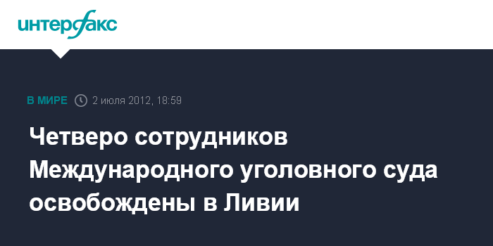 Триполи/Гаага. 2 июля. INTERFAX.RU - В Ливии освобождены четверо сотрудников Международного уголовного суда (МУС), сообщил в понедельник на пресс-конференции в Ливии председатель МУС Сан Хен Сон.