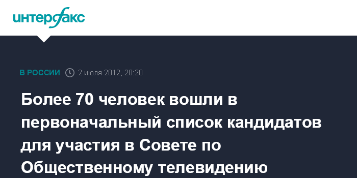 Москва. 2 июля. INTERFAX.RU - Проект списка кандидатов для приема в члены Совета по Общественному телевидению включает 72 кандидатуры, сообщили журналистам в понедельник по итогам заседания Межкомиссионной рабочей группы Общественной палаты (ОП) по вопросам модернизации, развития и разгосударствления СМИ.