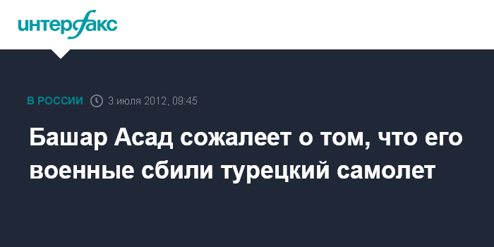 Анкара. 3 июля. INTERFAX.RU - Президент Сирии Башар Асад заявил, что сожалеет об инциденте со сбитым сирийскими военными турецком самолете.