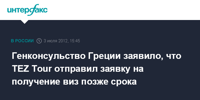 Москва. 3 июля. INTERFAX.RU - Заявка на получение виз в Грецию от туроператора TEZ Tour поступила в сервисно-визовый центр Греции значительно позже крайнего срока, установленного для срочных виз, говорится в сообщении генконсульства Греции во вторник.
